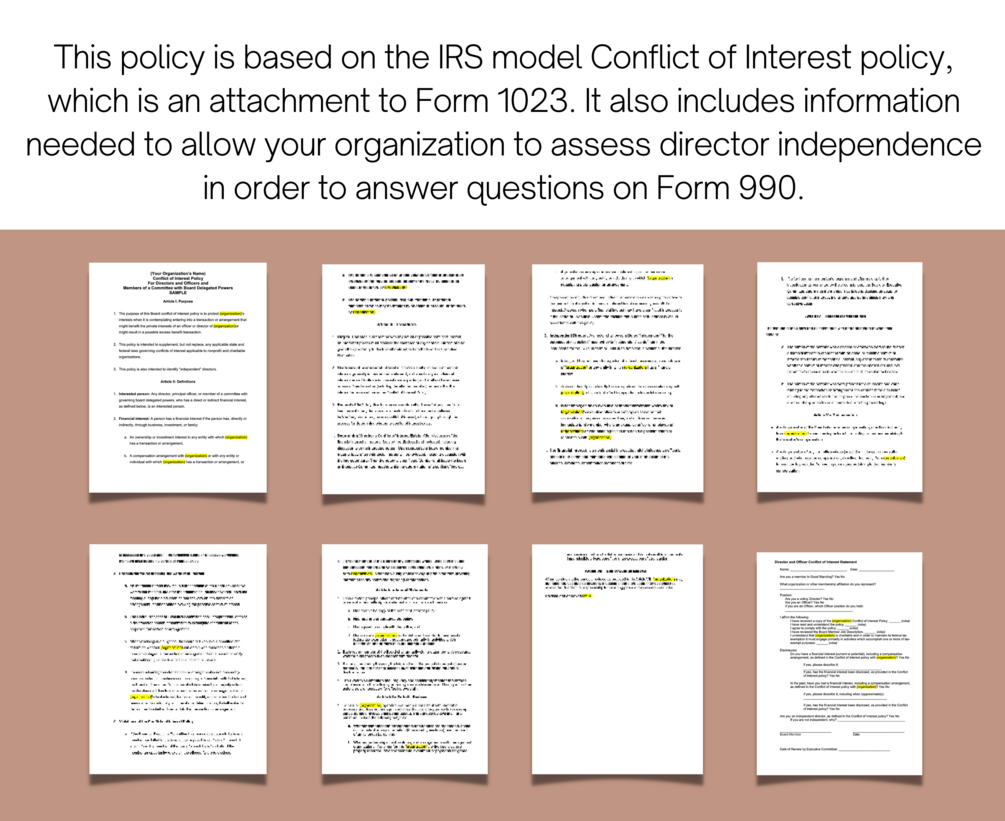 This policy is based on the IRS model Conflict of Interest policy, which is an attachment to Form 1023. It also includes information needed to allow your organization to assess director independence in order to answer questions on Form 990.
